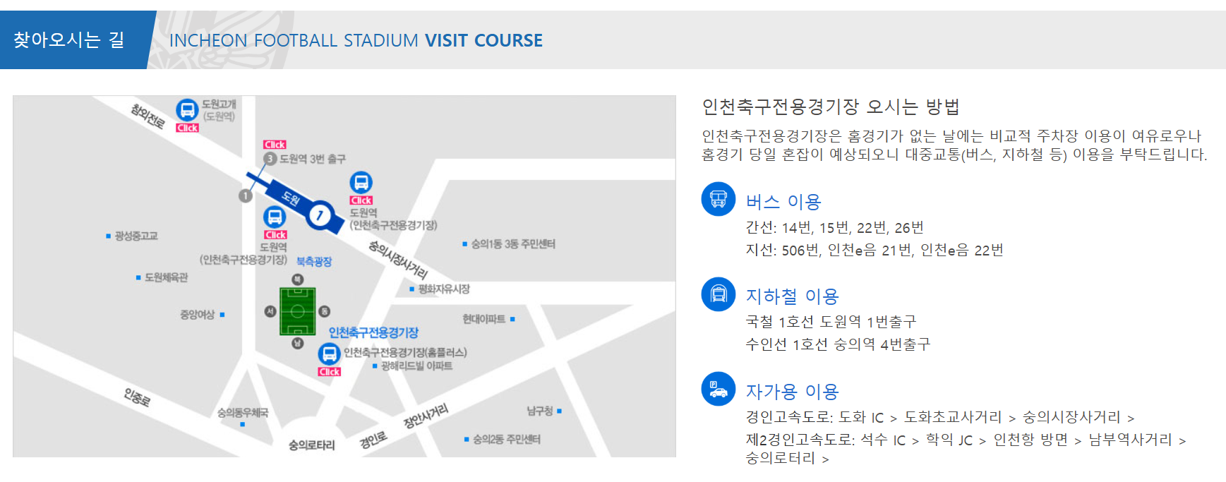 | 지하철 | 수도권 전철 호선 이용 | 도원역에서 경기장 바로 앞 |